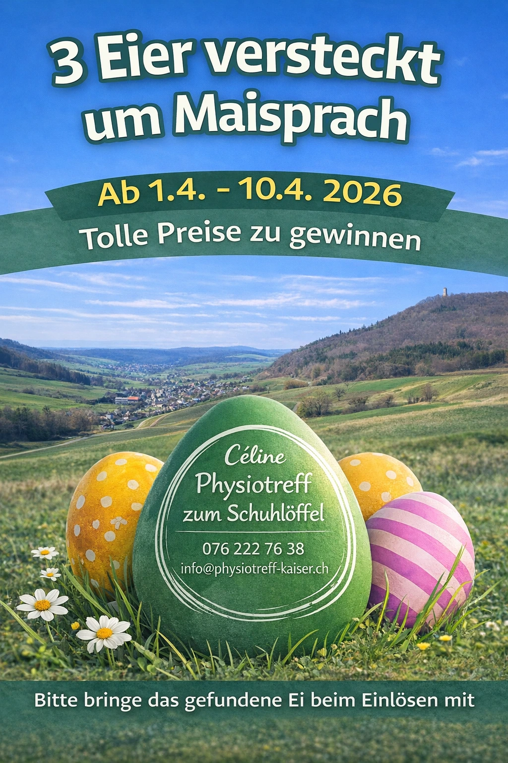 Ich bin per E-Mail an info@physiotreff-kaiser.ch, telefonisch unter +41 76 222 76 38 oder per Whatsapp erreichbar. Gerne nehme ich auch ausserhalb meiner Bürozeiten Anfragen entgegen und helfe dir bei allen Fragen und Anliegen, um einer schnellen Genesung den Weg zu bereiten.